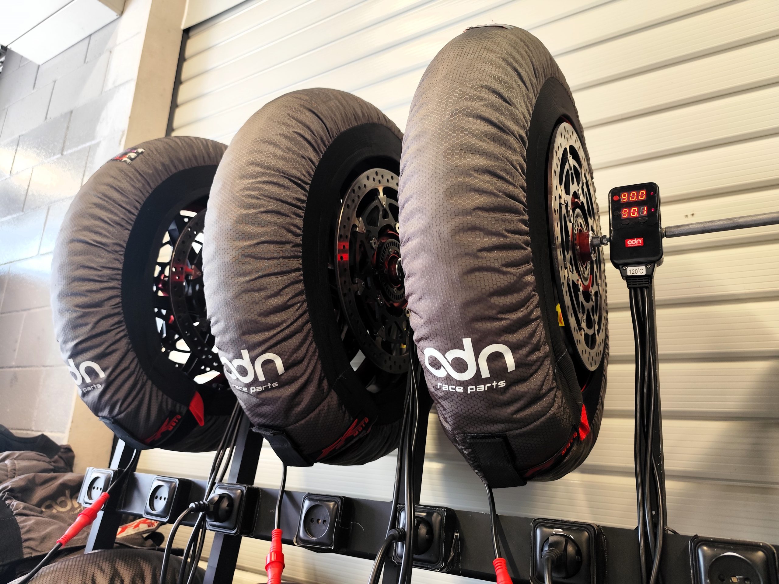 Calentadores neumáticos para motos de circuito en versión analógica con led de funcionamiento y termostato limitado a 80º C, y digitales regulables mediante centralita hasta 120ºC.