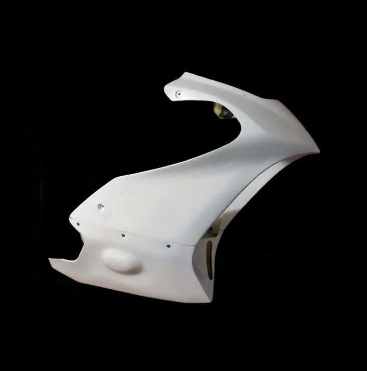 Primero y disponible en nuestra tienda online Kit carenado Pro en tres capas laminadas en fibra de vidrio flexible con refuerzos de fibra de carbono kevlar en zonas de alojamiento de tornillería, acabados en gel coat blanco brillo RAL 9010.